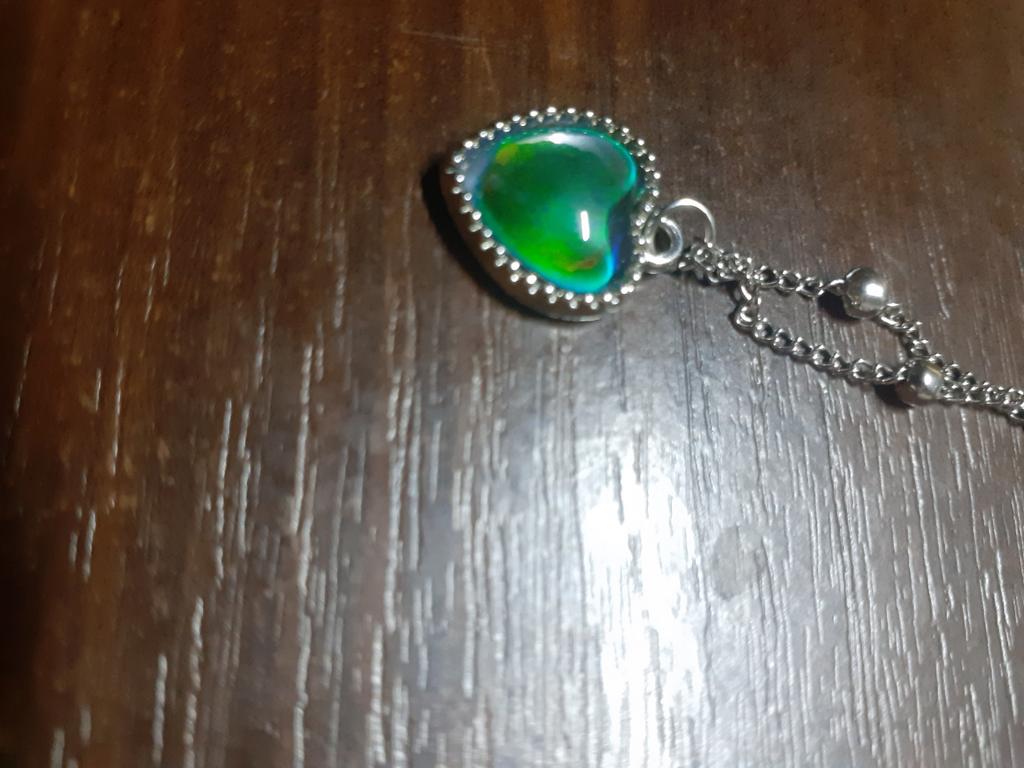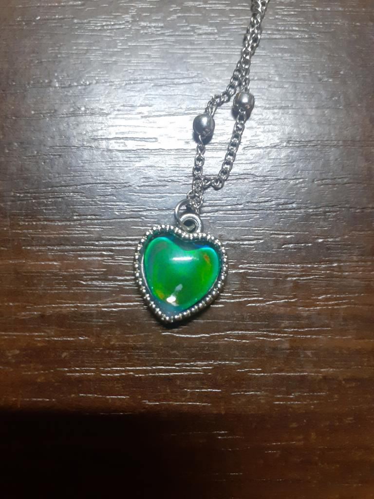 Кулон з підвіскою у формі серця. Кулон дійсно змінює колір в залежності від температури, наприклад, синій, зелений, коричневий, фіолетовий, сірий. Мені сподобався, кольори яскраві. Ланцюжок короткий, кулон можна носити тільки з цим ланцюжком, бо через декоративні кульки кулон не знімається. Ношу декілька тижнів, поки не темніє.