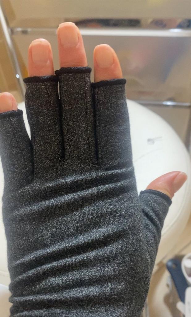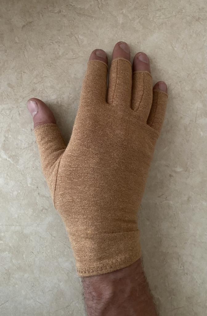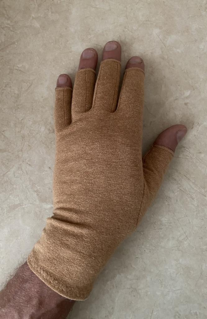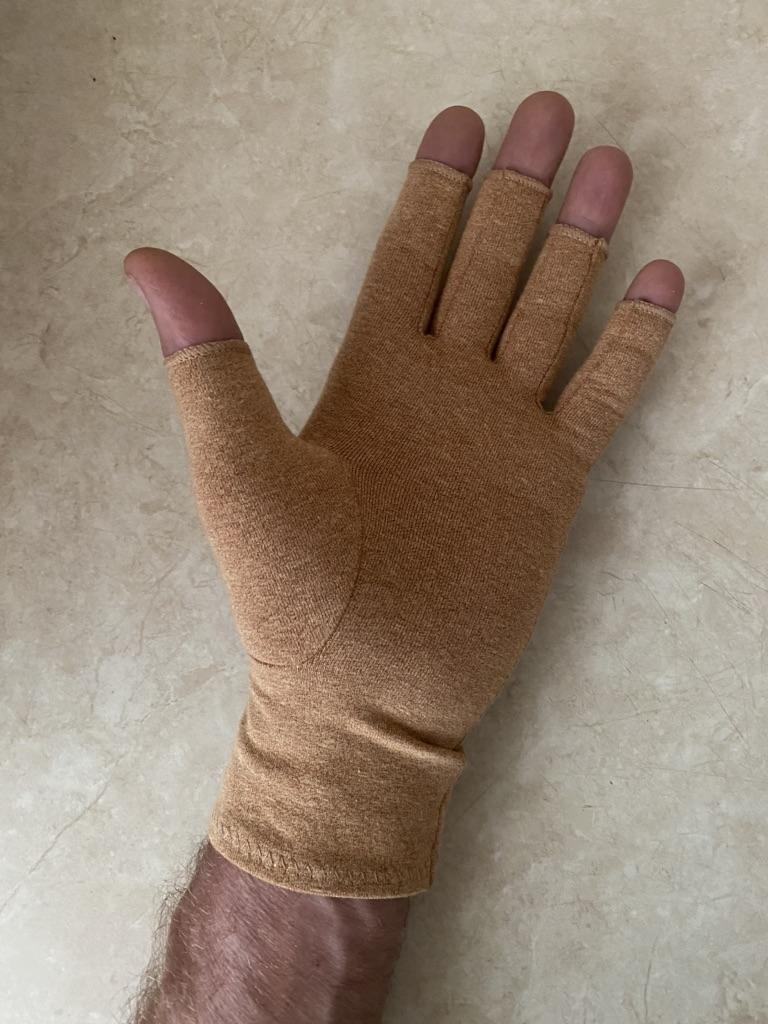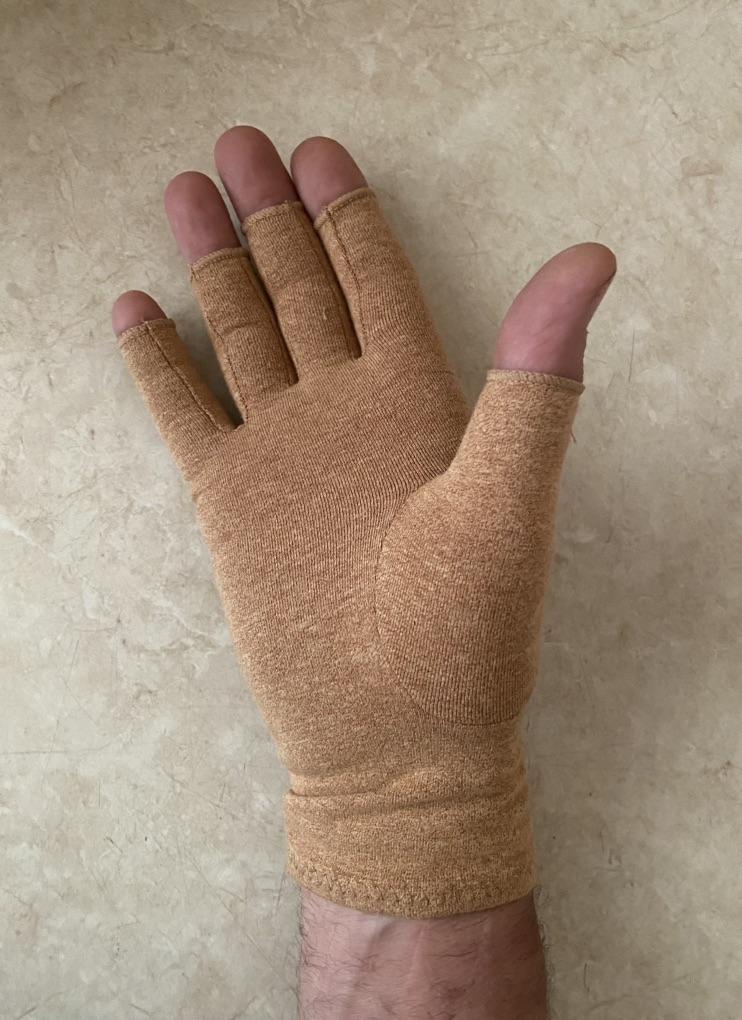 Замовляв розмір L. Для моєї вузької руки (ширина долоні 9 см) з довгими пальцями підійшло добре. Ефект стискання є, відчуття приємні. Матеріал еластичний без стороннього запаху.