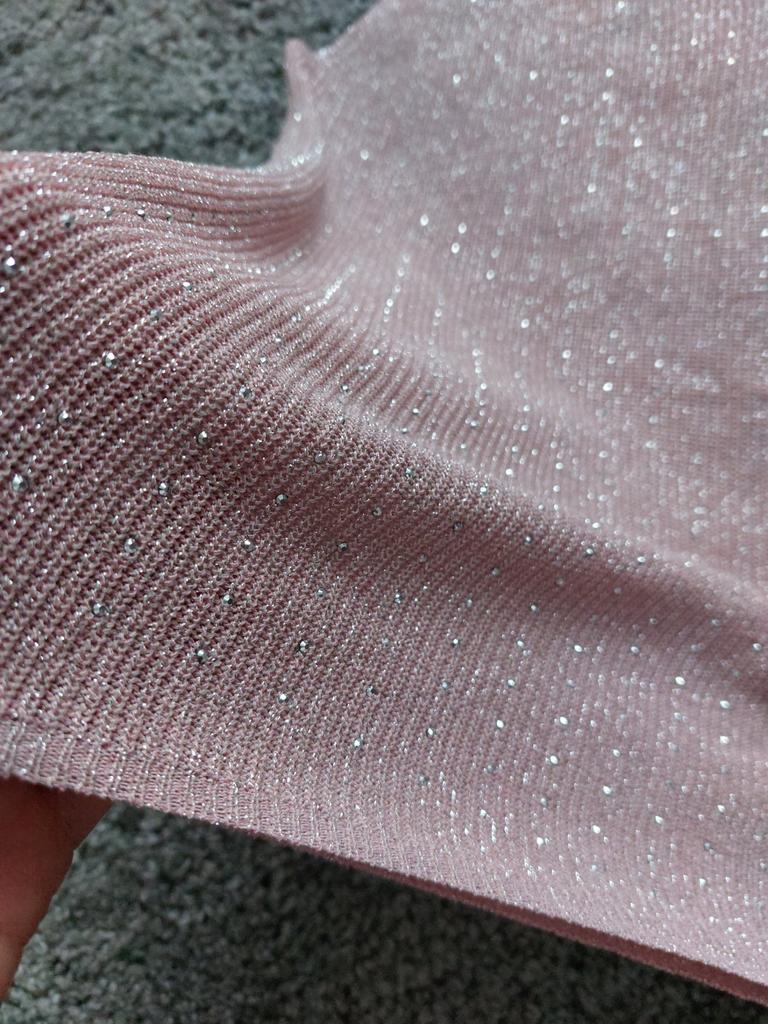 Майєчка дуже гарна. Ніжний колір. Паєтки виблискують делікатно, не перевантажено. Хто не сприймає блиск в одязі, то може не підійти. Мій ОГ 115 і маєчка по розміру підійшла, облягає комфортно. Одним словом я рекомендую до покупки.