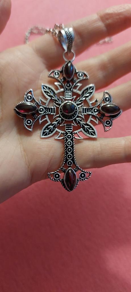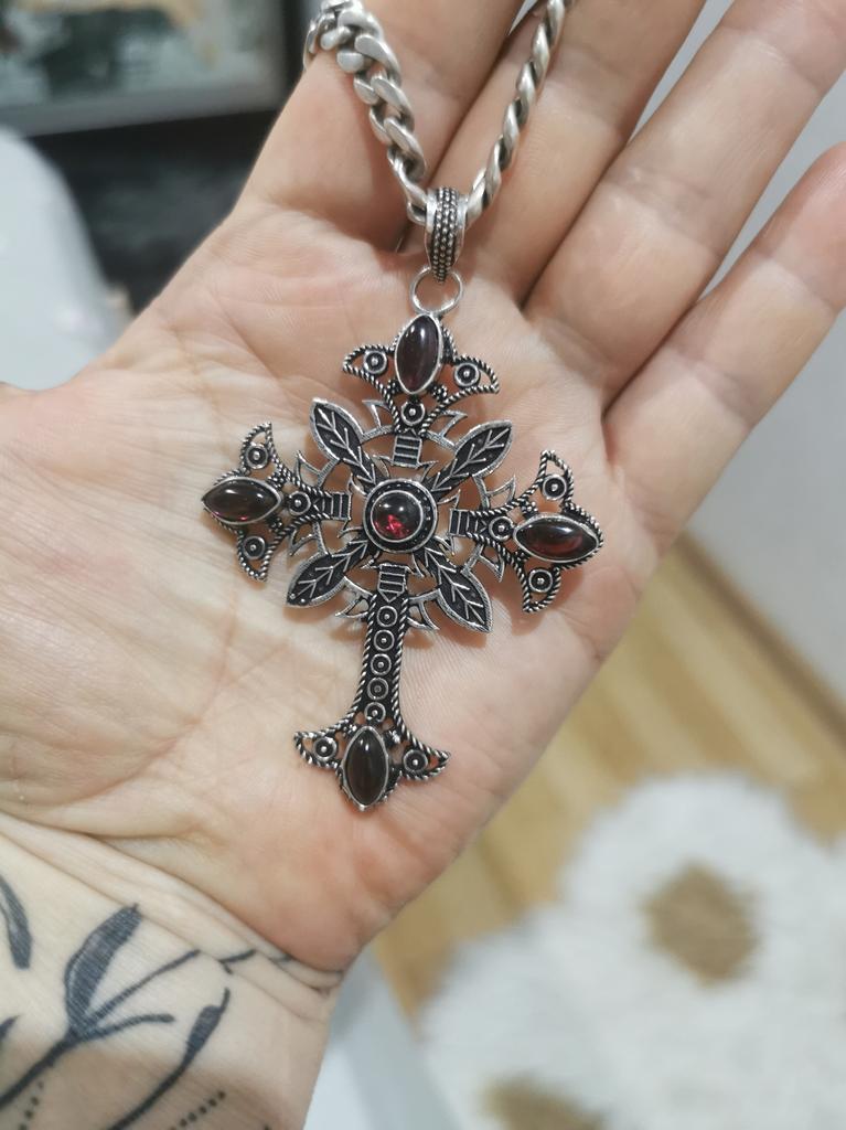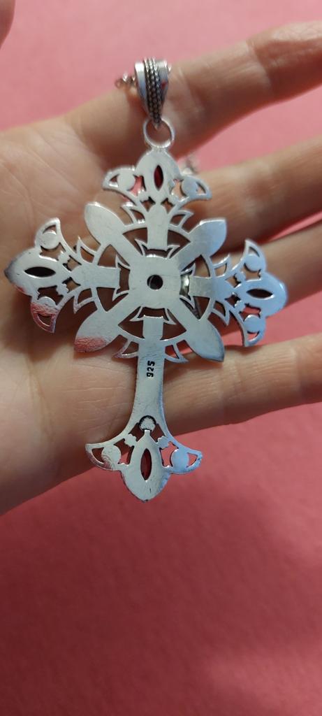 The cross is beautiful and large. On the back there is a stamp: 925. The chain in the photo is mine.