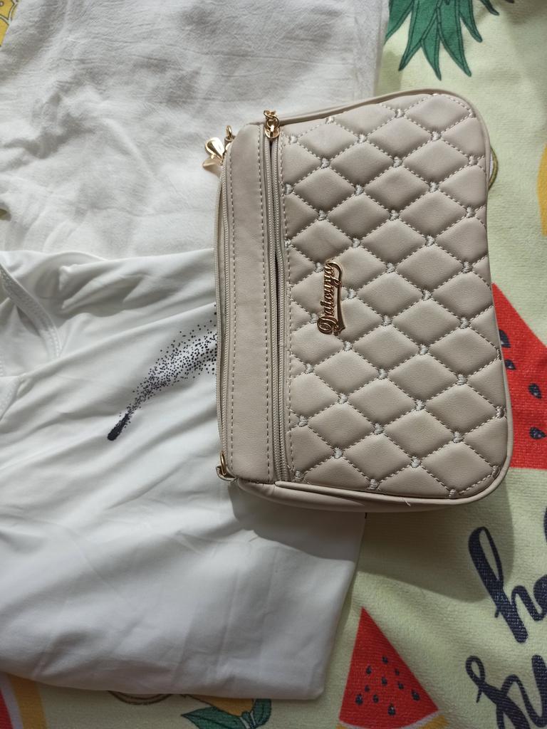 Сумочка гарна, але колір не відповідає опису. Коли читала відгуки, то зрозуміла це, але думала що вона молочного кольору. А насправді це бежевий колір. На фото, для порівняння, товари з одного замовлення штани і футболка, також "білого" кольору....