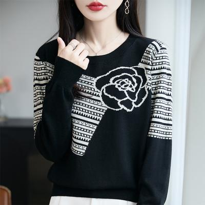 Весняно-осінній новий трикотажний светр з круглим вирізом і кольоровими блоками, жіночий топ з довгими рукавами та жакардовим візерунком троянди вільного крою для базового шару
