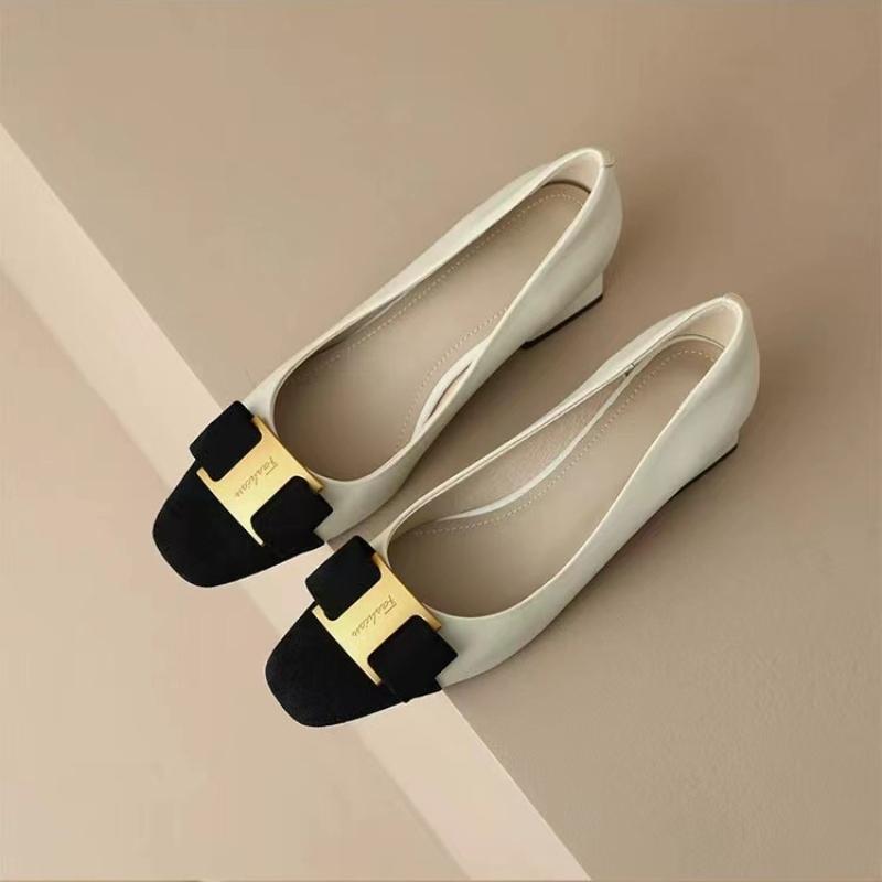 Fashion 2025 Female Shoes Classic Thick Heel Bow Metal Decoration Lady Pumps Simple Square Head Leather Women Single Shoes