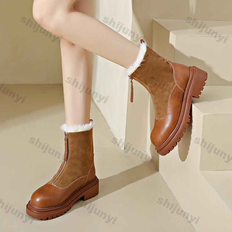 Vintage Thick Soled Warm Pu Leather Ankle Boots for Women Winter Non Slip Boot Woman Platform Plush Lace Up Cotton Shoes