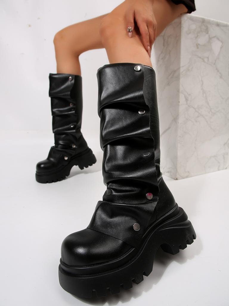 Fashion New 2025 Women's Thick Bottom Buckle Fold Boots Shoes Round Toe Punk Wrinkles Boots Block High Heels Cool Female
