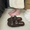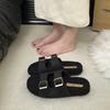 2025 autumn new belt buckle thick bottom fluffy slippers women wear warm Korean version one word lazy cotton slippers tide