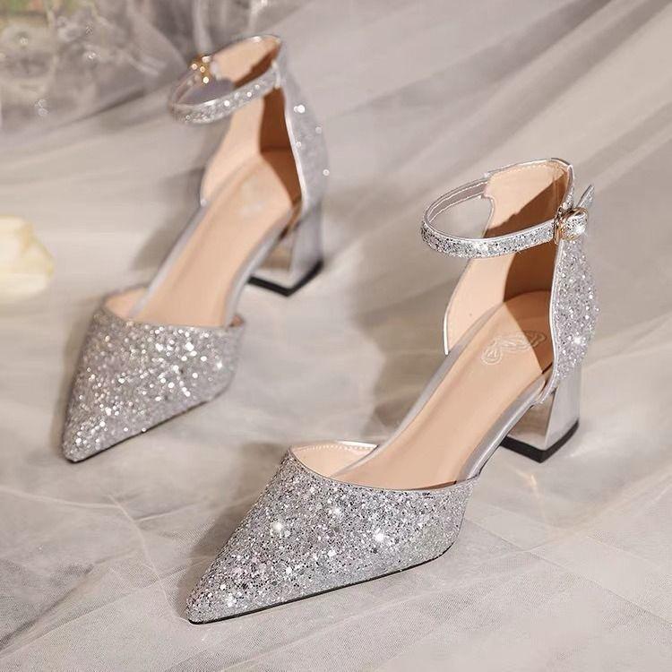 Sequins hollow word with single shoes high heels women's spring and summer new fashion thick heel high heel bag head sandals women