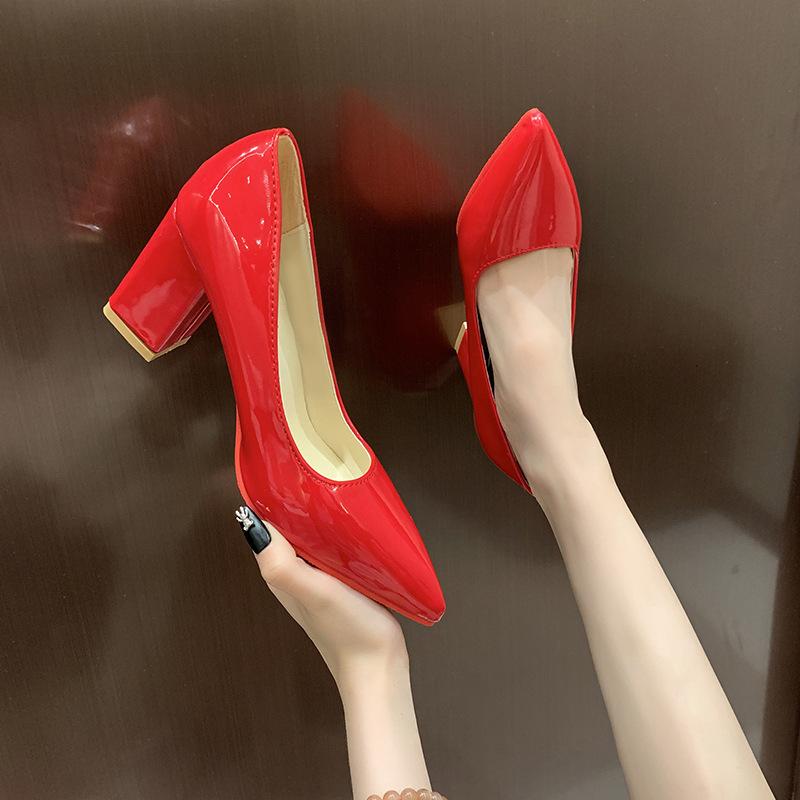 Square head single shoes female celebrity patent leather high heels thick heel pedicure shallow mouth foot cover professional shoes women's shoes